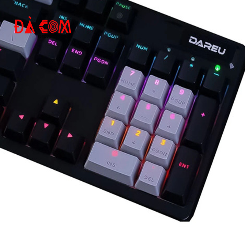 Bàn phím còn được trang bị đèn nền RGB đa vùng, có thể tùy chỉnh hàng chục hiệu ứng ánh sáng khác nhau thông qua phần mềm DAREU Control Center hoặc các tổ hợp phím tắt. Chân đế chống trượt, có thể điều chỉnh góc nghiêng giúp người dùng thoải mái hơn khi sử dụng trong thời gian dài.