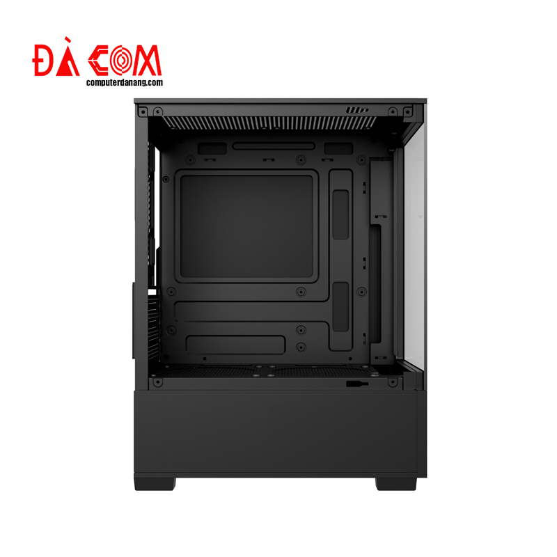 Phía trước của vỏ case được thiết kế các khe hút gió rộng rãi, đảm bảo luồng khí đi vào hiệu quả. Đồng thời, mặt trên và mặt sau được bố trí khe thoát khí hợp lý, giúp tản nhiệt nhanh chóng cho CPU, GPU và các linh kiện quan trọng khác. Màu sắc chủ đạo là đen phối viền kim loại tinh tế, tạo vẻ sang trọng, phù hợp với nhiều phong cách setup khác nhau, từ gaming đến workstation chuyên nghiệp.